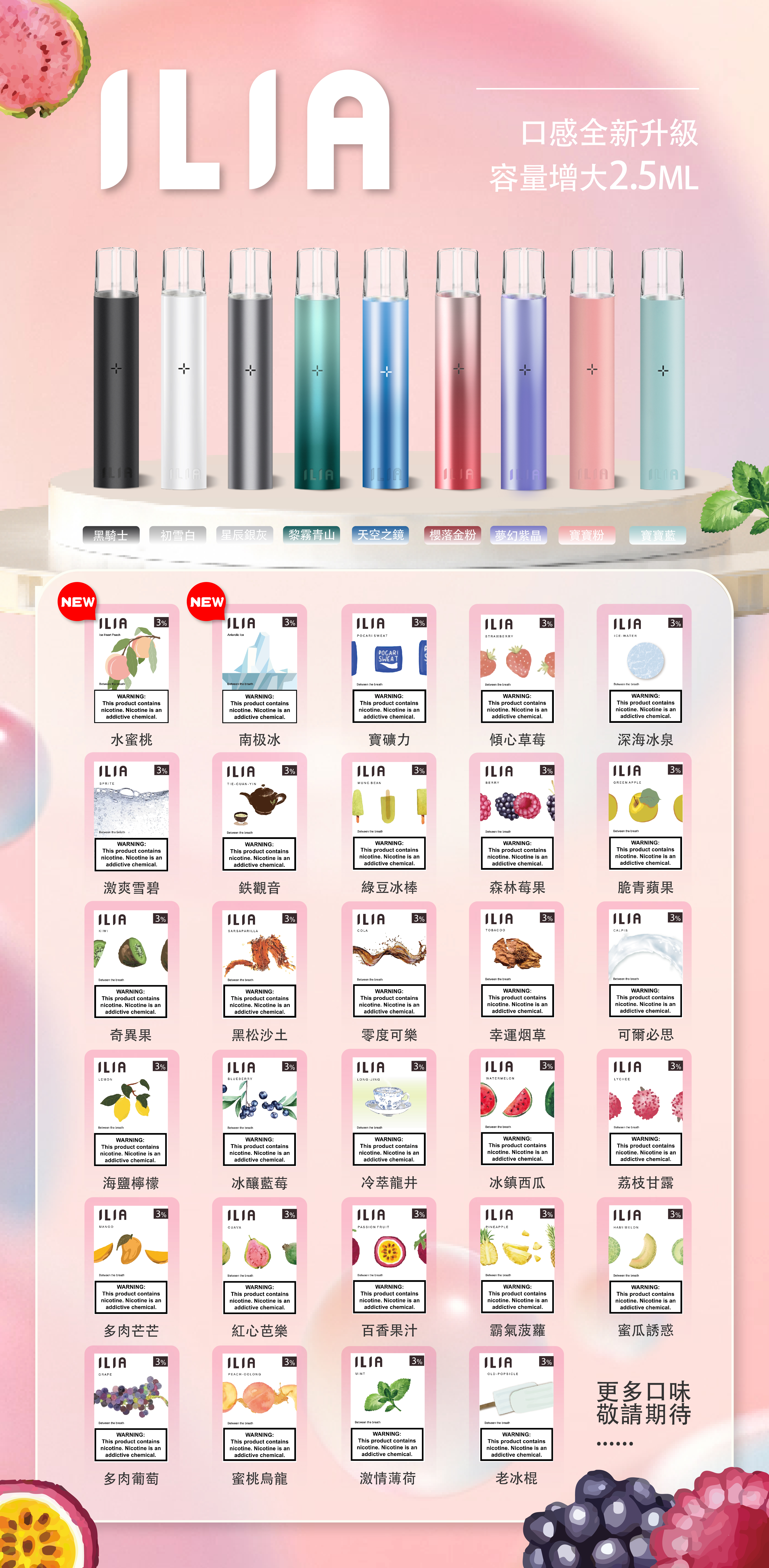 綠豆, 薄荷, 可樂, 西瓜, 葡萄, 荔枝, 龍井, 哈密瓜, 百香果, 白桃烏龍, 草莓, 冰泉, 芭樂, 芒果, 藍莓, 檸檬, 蘋果, 莓果, 奇異果, 鐵觀音, 雪碧, 寶礦力, 幸運菸草, 鳳梨, 老冰棍, 沙士, 南極冰, 水蜜桃